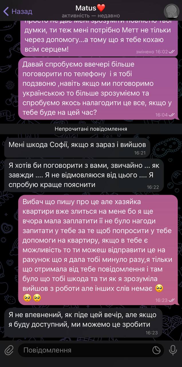Але мені треба твоя допомога в тому що потрібно заплатити за квартиру,я я роблю все що можу але дуже важко і надіюсь на твою підтримку,вибач якщо чесно мені завжди соромно,але немає виходу зараз і моя надія ти,я хочу нову роботу я хочу інше життя я втомилась від ракет і моя радість та підтримка це ти і я дуже вдячна тобі за все бо я б не змогла без тебе вижити,це правда,але я ціную ці важкі часи в які ти зі мною і я з тобою до кінця,я тебе люблю всім серцем Метт❤️