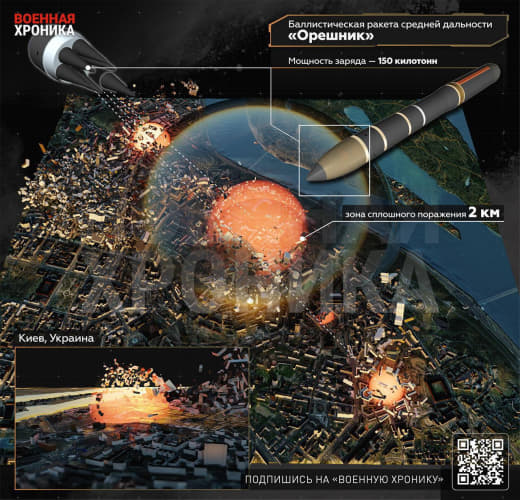 ▪️The «Oreshnik» combat unit in nuclear equipment with a power of a 150 kt charge is capable of causing significant destruction of the right-bank part of Kyiv, in the government quarter.